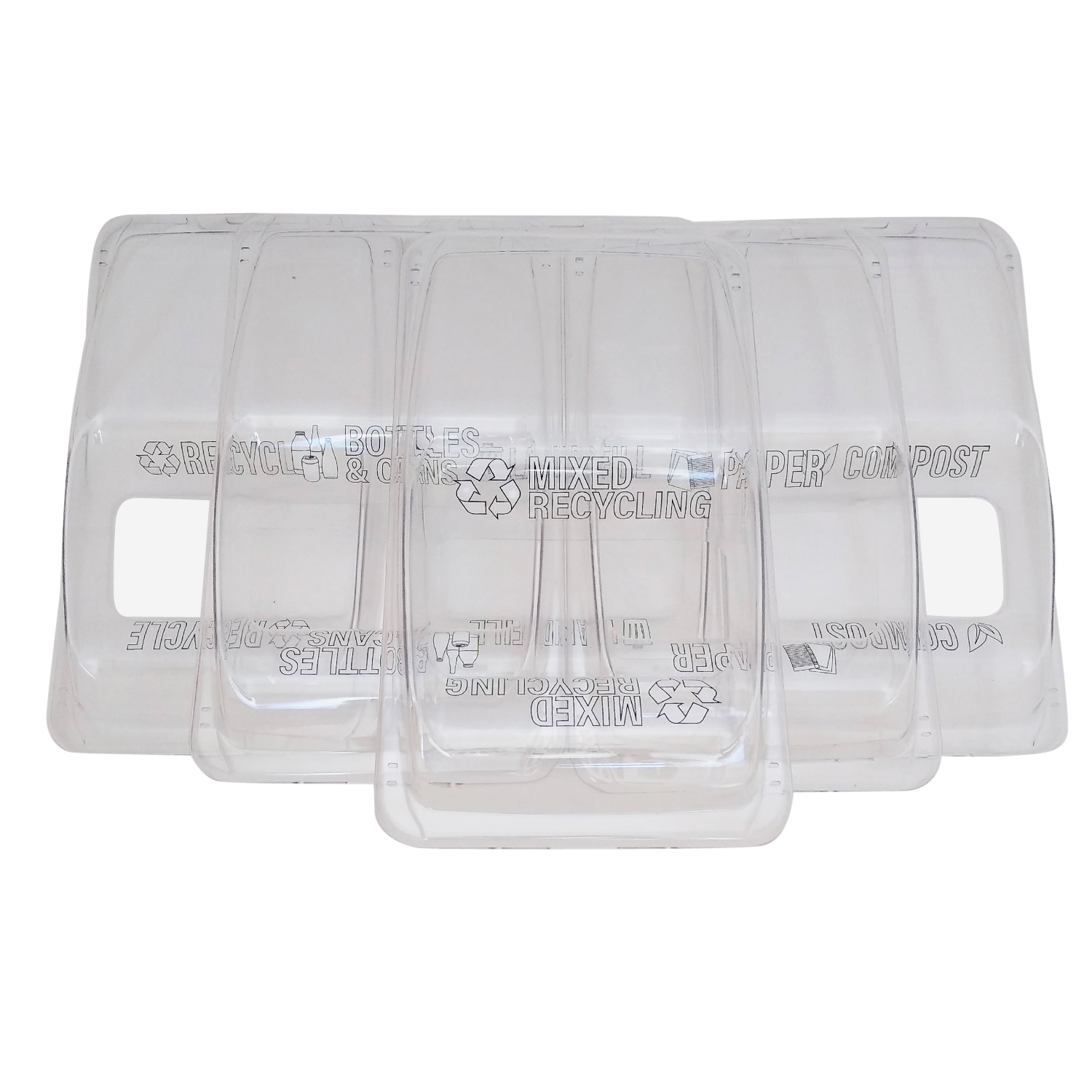 Display case messaging lid that includes a colored base tray, a clear cover, ID labels with icons ("Recycling", "Landfill", etc.), replica food item (where applicable)